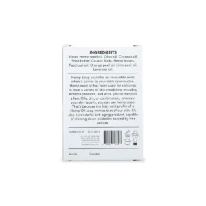 Water, hemp seed oil, olive oil, coconut oil, shea butter, sodium hydroxide, hemp leaves, patchouli oil, orange peel oil, lime peel oil, lavender.